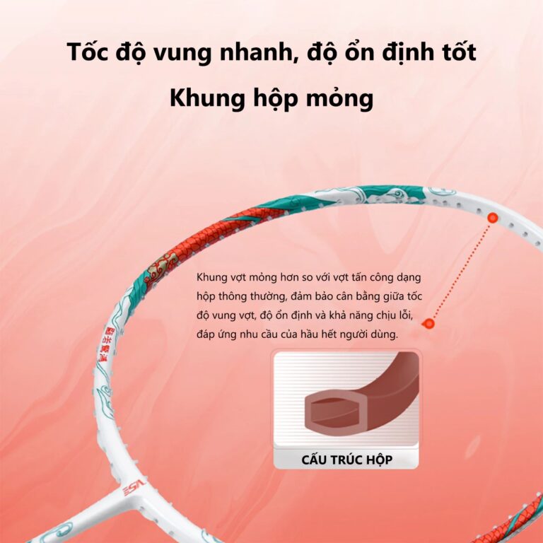 Khung hộp mỏng (Thin Box Frame): Vợt sử dụng cấu trúc khung hộp được tối ưu mỏng hơn. Thiết kế này tạo ra sự cân bằng lý tưởng giữa tốc độ vung vợt nhanh và độ ổn định cao, đồng thời vẫn đảm bảo khả năng chịu lực tốt khi đập cầu, đáp ứng nhu cầu của hầu hết người dùng.